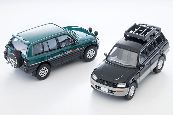 ●初代RAV4 J Vに新仕様が登場! ●ルーフキャリアなどオプションパーツにも注目 ●今となっては懐かしい90's RV いまや世界中の乗用車のスタンダードとなっている横置きエンジンのSUV。その元祖といえるのが、1994年に登場した初代RAV4でした。当初は3ドアのショートボディだけで現れたRAV4ですが、翌年にはVの名を冠した5ドア仕様が追加され、人気がさらに盛り上がりました。海外でも評価は高く、オープントップ仕様やハイパワーエンジン車、電気自動車など様々なバリエーションを追加しながら2000年まで生産されました。 TLV-NEOでは初代RAV4の5ドアを新たな仕様で展開いたします。日本市場では販売店によりLとJのサブネームがつき、それぞれフロントグリルの網目で区別されました。今回はオート店で販売されたJを2色展開いたします。1990年代中頃のRVブームを反映した、ルーフキャリアなどのオプション装着状態としました。様々な仕様が楽しいRAV4は続々と展開中です。(文責:トミーテック)