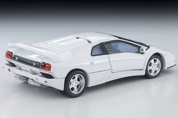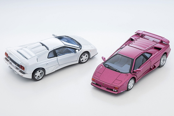●待望のディアブロ SE30が新登場 ●ドア開閉、エンジン再現! 1993年、ランボルギーニ社は創業30周年記念モデルとしてディアブロSE30を発表。ベースモデルに比べエンジンのパワーアップ、足回りを改良し、内外装の一部もリデザインされました。 SE30は1995年までに150台が生産されましたが、1994年にはレース参戦を考慮した更なる高性能仕様を追加。かつてのスペシャルモデル「イオタ」の名が与えられ、特別なSE30として約20台が生産されました。 TLV-NEOではディアブロのSE30とSE30イオタを新金型で製品化。どちらもシザードアおよびエンジンフード開閉。SE30イオタはエンジンフードとエンジン、シートの形状などイオタ専用パーツを極力再現しました。1/64スケールでの製品化が意外に少ないディアブロ、特にSE30をぜひTLV-Nでもお楽しみください。(文責:トミーテック)
