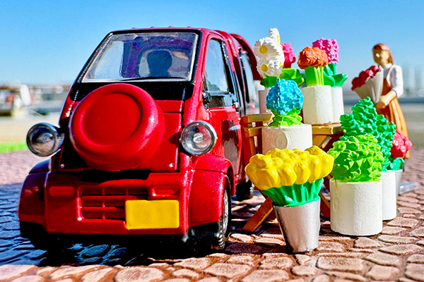 ●専用仕様のミゼットIIが付属 ●荷室にも花が積めて楽しい! ●花をさまざまに並べて映える! SNSで盛り上がっている、ミニカーやトイを使った「映え」写真。単に撮影するだけでなく、フィギュアや情景アイテムと組み合わせるなど、いろいろな工夫を楽しむ人たちが増えています。そこでトミーテックが提案したのが、「ジオコレ64 #カースナップ」です。今回は移動販売の「花屋」がテーマのフィギュア・小物のセットです。ダイハツ ミゼットII カーゴが専用仕様で付属します。 お花を満載にしてやってきたお花屋さんは街のみんなの人気者。今日もミゼットIIの前でさまざまなお花を並べ、ほこりまみれの、かわいた都会にも花が咲いています。#カースナップで発売中の移動販売車やお手持ちのミニカーと合わせても更に世界が広がります。クルマとその周辺が映える写真をSNSに投稿して、#カースナップや#TLVを盛り上げましょう。 【セット内容】 ①ダイハツ ミゼットII カーゴ ②店員 ③バラ ④チューリップ ⑤ネモフィラ ⑥ヒマワリ・カラー ⑦ガーベラ・ヒヤシンス ⑧ピスタキア ⑨ユーカリ ⑩机 ⑪椅子 ⑫サインボード(文責:トミーテック)